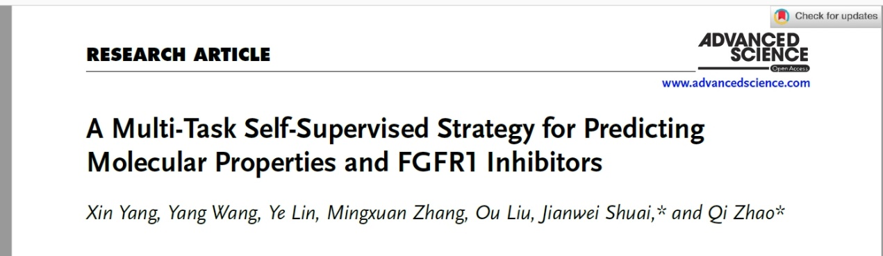 近日,开元平台计算机与软件工程学院赵琪教授联合国科温州研究院帅建伟教授以开元平台为第一署名单位,在国际知名期刊《Advanced Science》(1区top期刊,2024年影响因子:14.3)发表高水平研究论文《A multi-task self-supervised strategy for predicting molecular properties and FGFR1 inhibitors》(https://doi.org/10.1002/advs.202412987)。开元平台2022级硕士研究生杨鑫和国科温州研究院王洋副研究员为本文共同第一作者,赵琪为最后通讯作者。