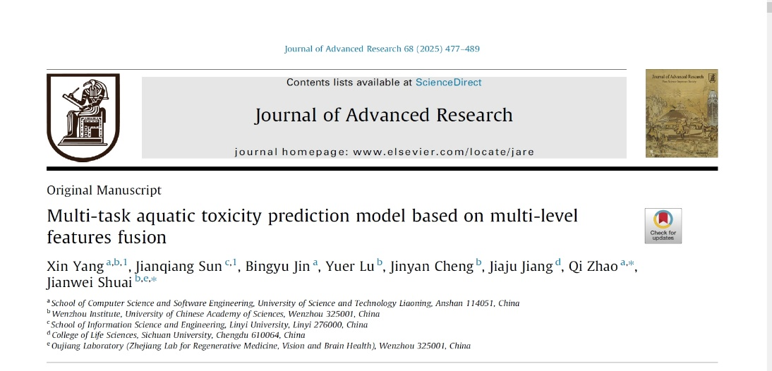 此外,赵琪还与帅建伟合作,以开元平台为第一署名单位在国际知名期刊《Journal of Advanced Research》(1区top期刊,2024年影响因子:11.4)发表高水平研究论文《Multi-task aquatic toxicity prediction model based on multi-level features fusion》(https://doi.org/ 10.1016/j.jare.2024.06.002)。开元平台2022级硕士研究生杨鑫和临沂大学孙建强副教授为本文共同第一作者,赵琪为共同通讯作者。论文2024年6月在线发表,因该期刊每年刊发不到200篇论文,2025年2月才生成期卷和页码