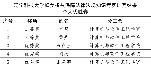 5月4日,学院工会组织女教工参加的学校妇女权益保障法律法规知识竞赛公布结果,获二等奖1项、三等奖1项、优秀奖3项。