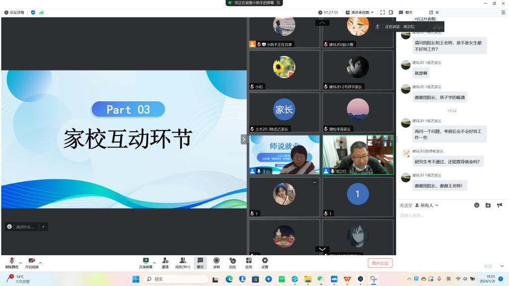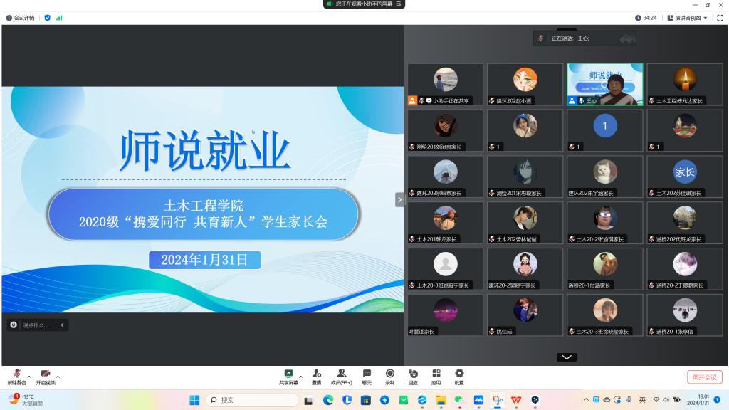 2月1日,开元平台土木工程学院“家校共育,共促就业”家长会于线上召开,学院院长周卫红教授应邀出席并围绕职业生涯规划和就业指导等内容展开宣讲,2024届毕业班辅导员、全体毕业生及家长参加会议。