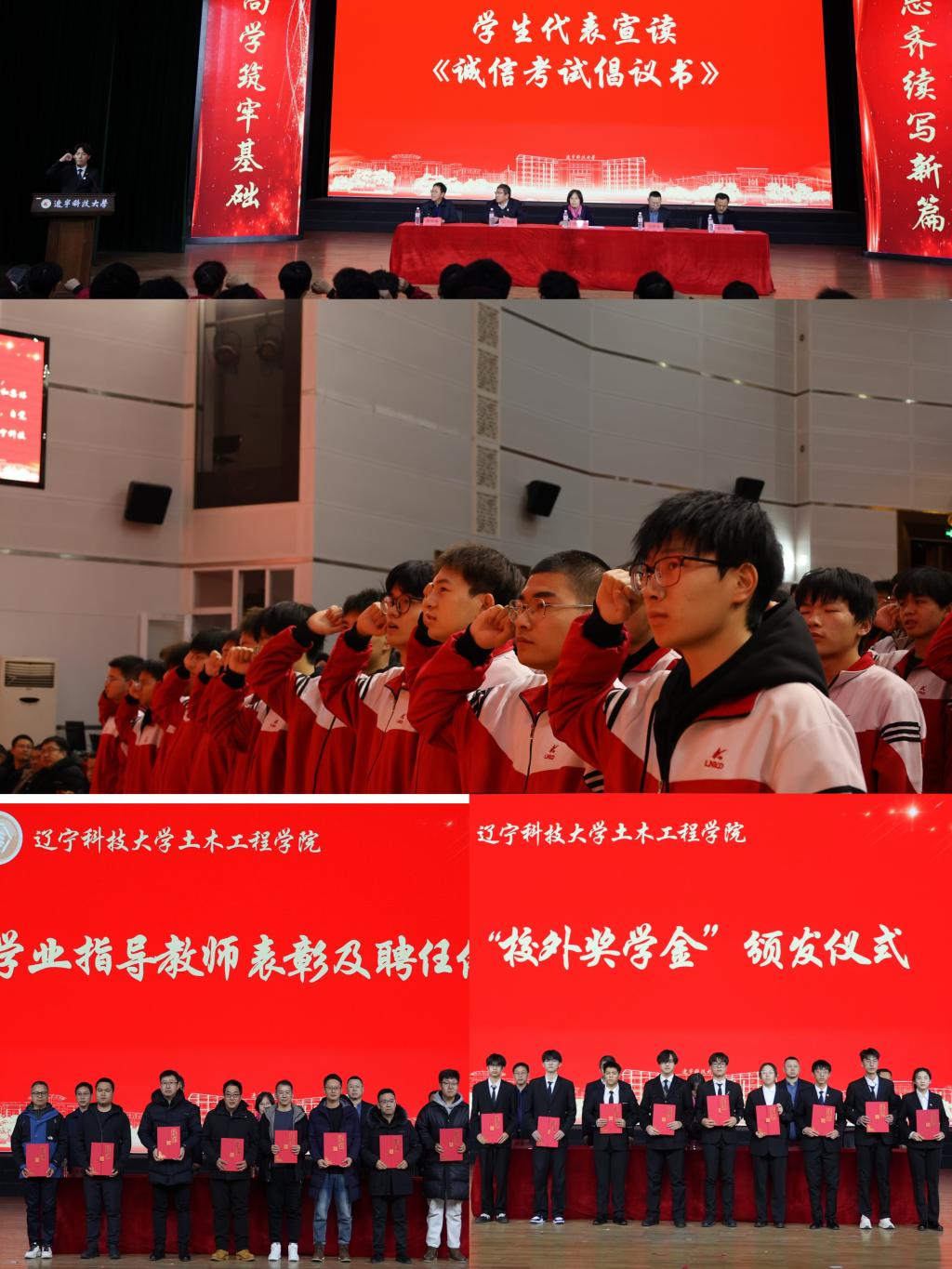 会议在雄壮激昂的国歌声中拉开帷幕。学院院长周卫红作教风学风建设动员讲话,他从学院推进建设智能建造产业学院和土木类创新“3+1”人才培养模式入手,强调持续推动学风建设向纵深发展的重要性。通过详细分析制约学院教风学风建设的突出问题,周卫红指出新年度加强学院教风学风联动的具体要求:一是把解决实际问题作为一切工作的出发点;二是加强多方联动,充分发挥“三全育人”作用;三是一体推进教育教学改革与加强人才培养,制定切实可行的实施方案;四是狠抓学生好习惯工程建设,引导学生制定清晰目标,形成齐抓共管强大合力。学生代表、院学生会执行主席齐祚宁带领全体同学宣读《诚信考试承诺书》, “严守考试纪律、净化考场秩序、严格规范自己,捍卫道德底线和集体荣誉......”的誓言响彻整个礼堂。